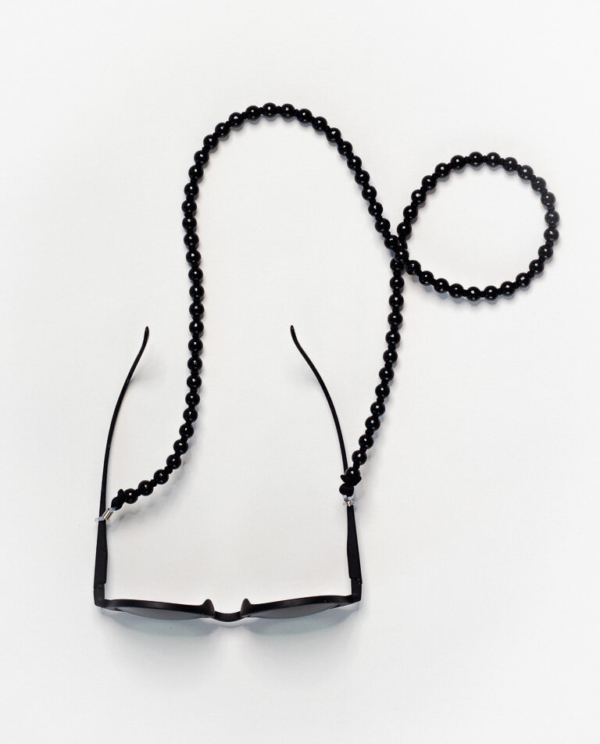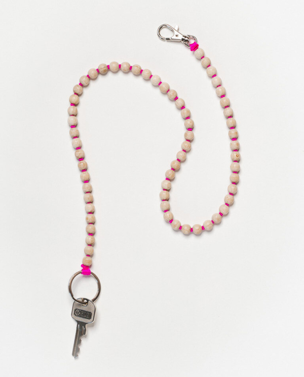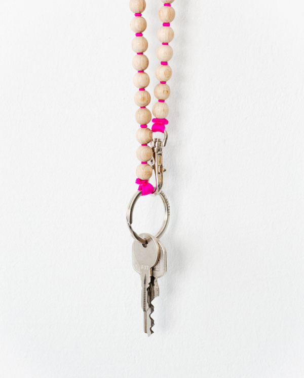 Schlüsselanhänger mit bunten Holzperlen, aufgefädelt auf ein elastisches Band.